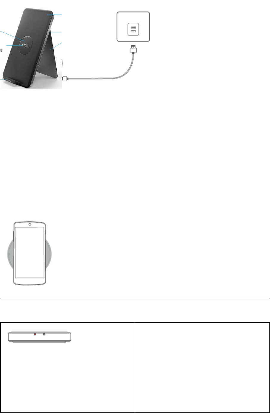 【图片 1:charger 直立,手机在正中间;图片 2:charger 放平,手机在正中间】