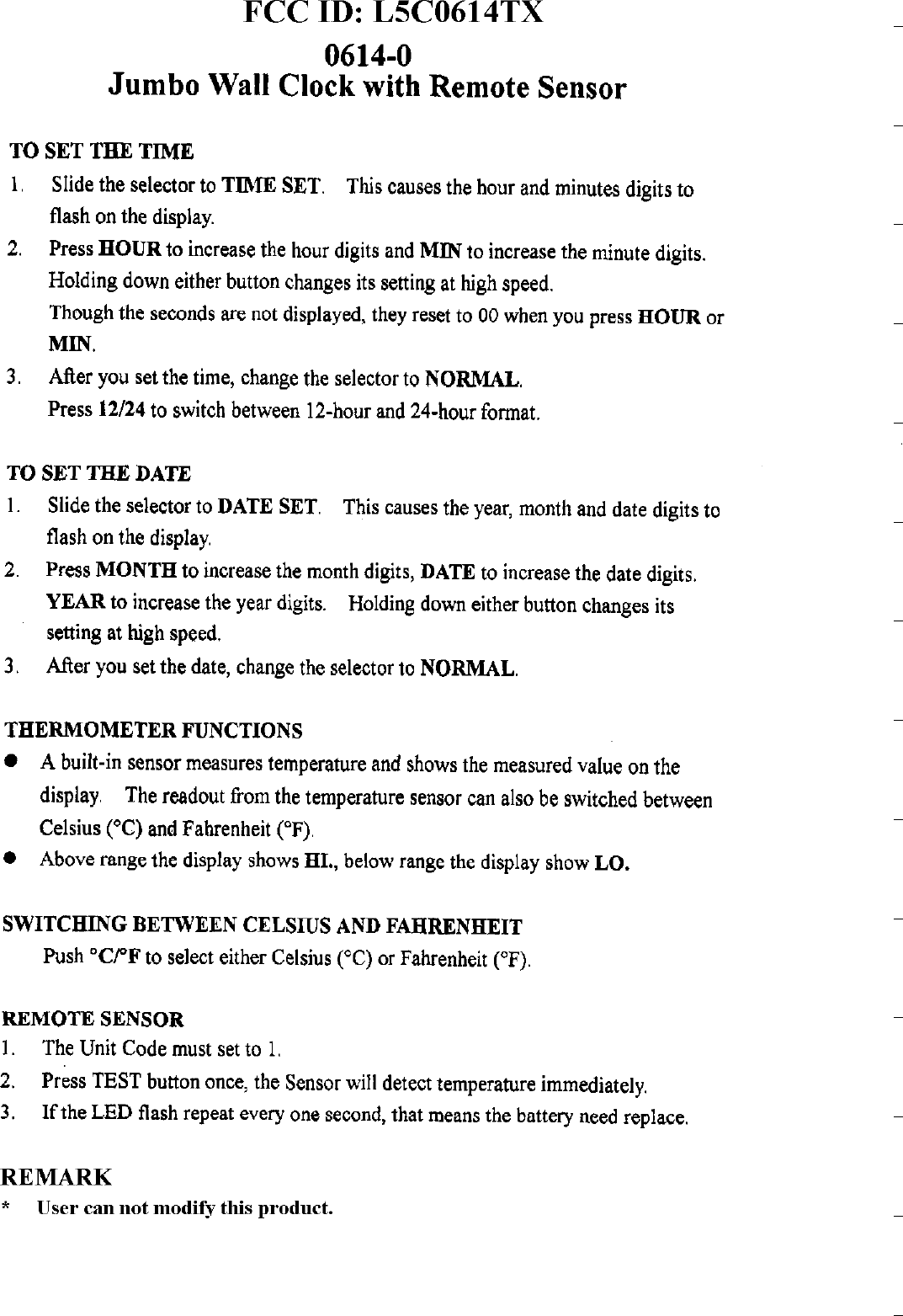 Ansen Electronics Co 0614TX Transmitter Unit for RF Wall Clock User Manual Unknown