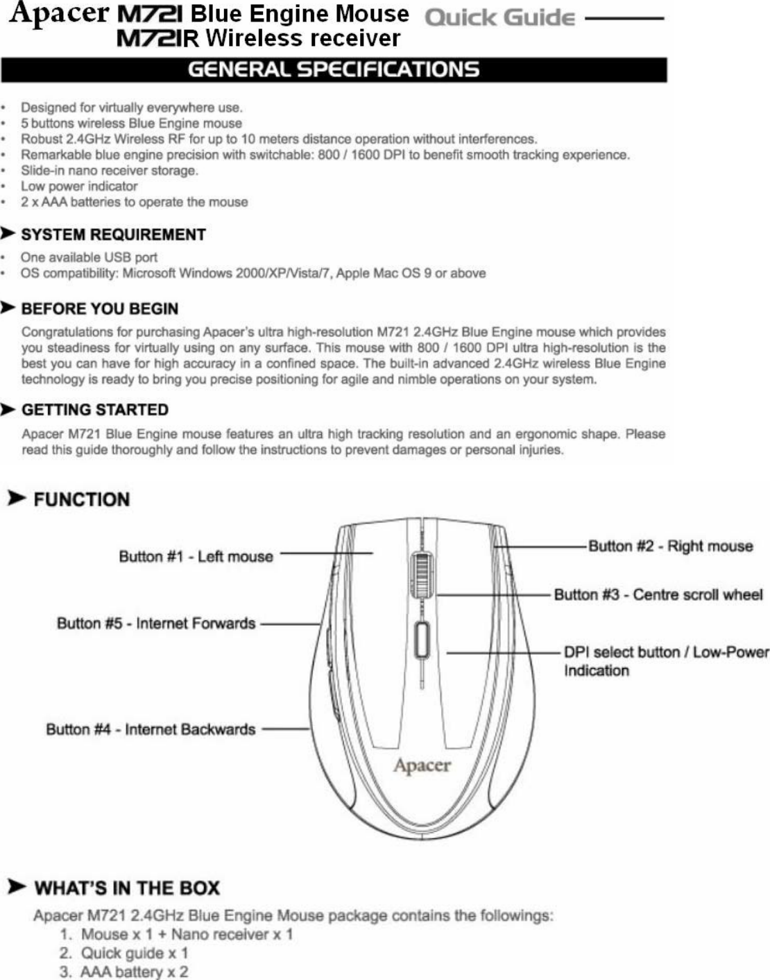 Apacer Technology M721 Apacer Blue Engine Mouse User Manual