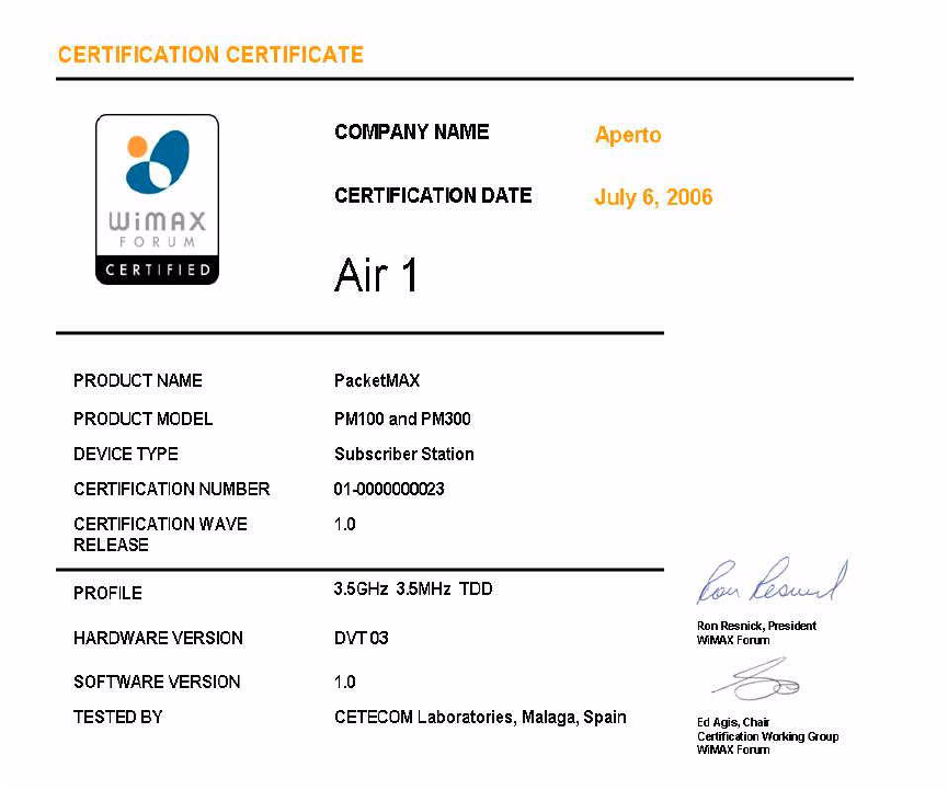 Aperto Networks Inc. of 598 Gibraltar Drive, Milpitas CA 95037, USA, declare under our sole respon-