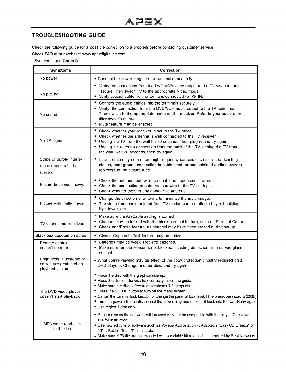 Check your owner's manual under "Troubleshooting Guide" and visit our website www, apexdigitalinc,com for the latest