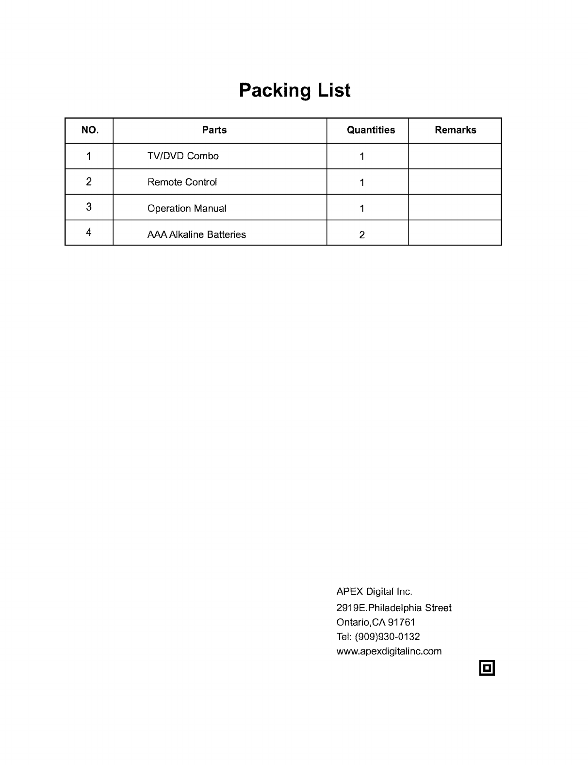 hase from an authorized Apex Digital, Inc, dealer in N, America, Keep your original box and packaging in case your unit