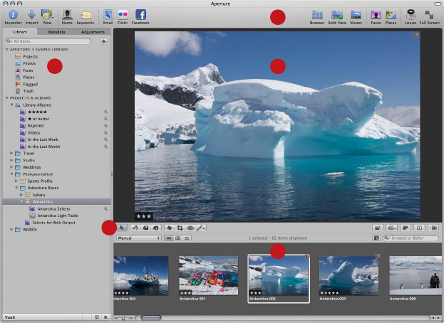 A Viewer B Browser C Inspector pane (Library inspector, Metadata inspector,
