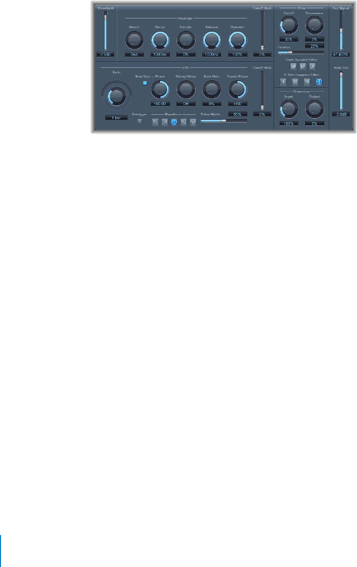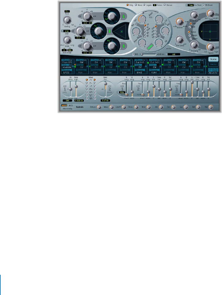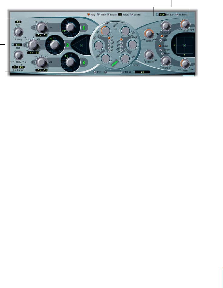 - Tres osciladores de diente de sierra desafinados y el modo Unison