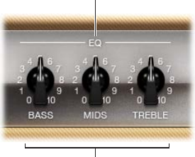•Bass, Mids, and Treble knobs: Adjust the frequency range levels of the EQ models, similar to the