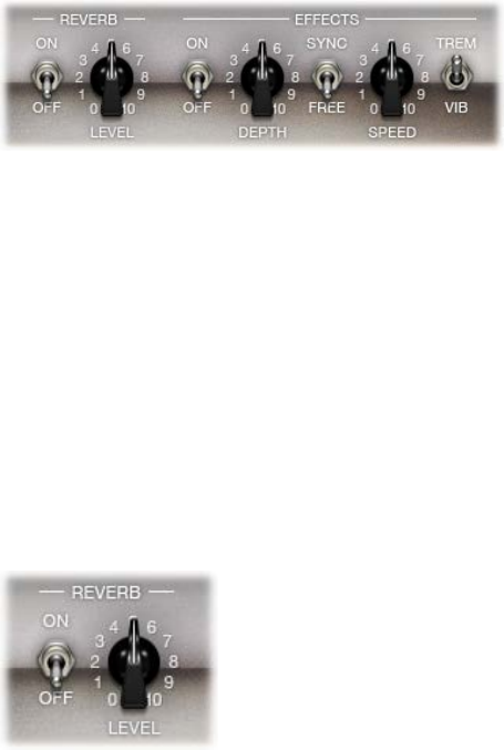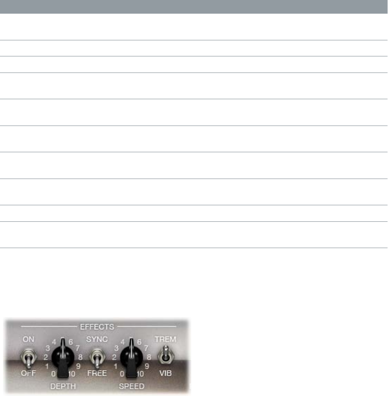 The eects parameters include Tremolo, Vibrato, and Reverb, which emulate the processors found