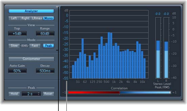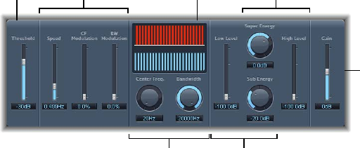 •Gain knob: Sets the amount of pre-amplication applied to the input signal. This control has