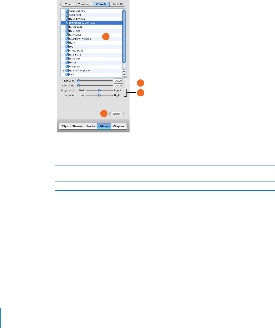 AEffects list: Select an effect in this list to change the appearance of clips in your movie.