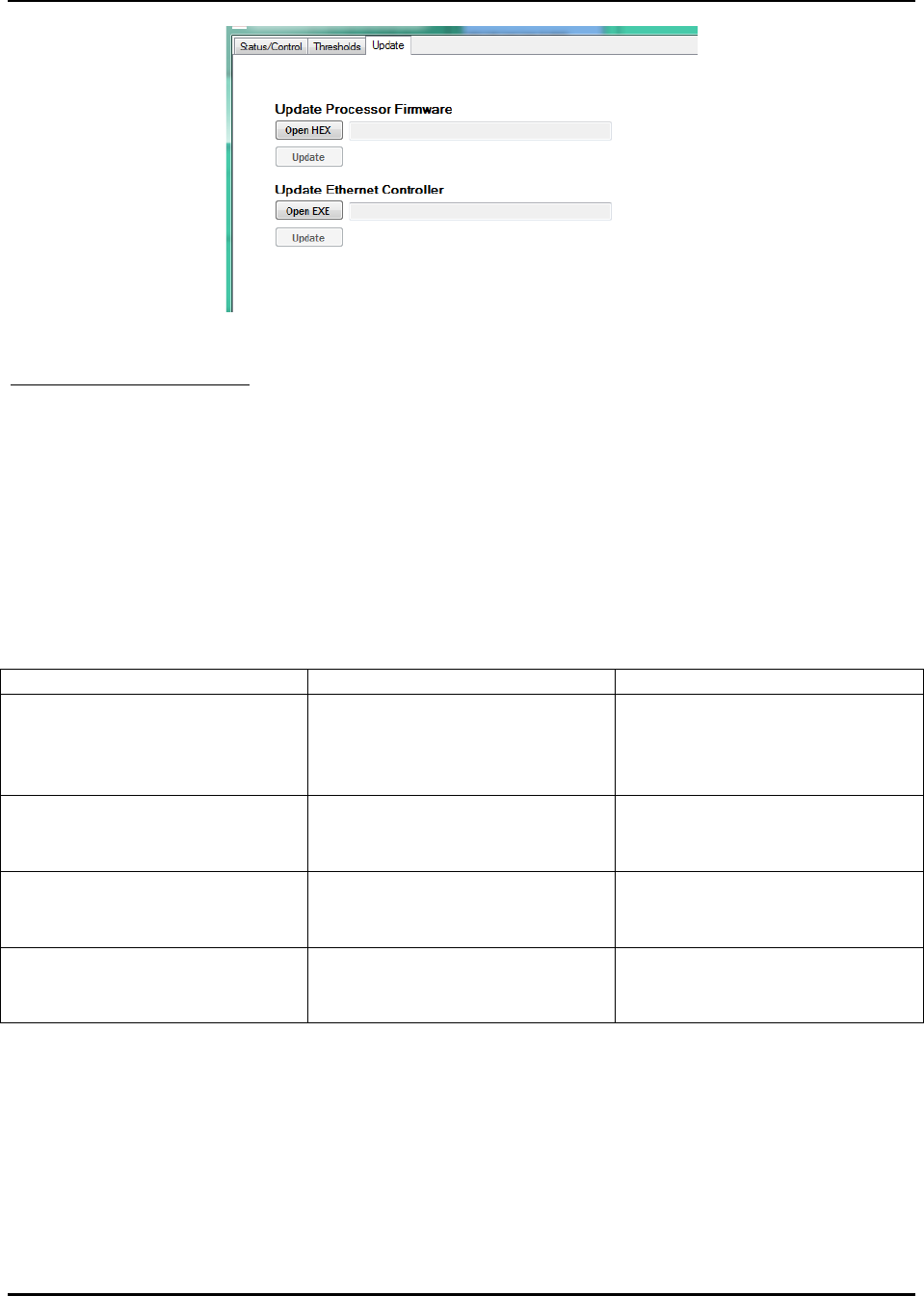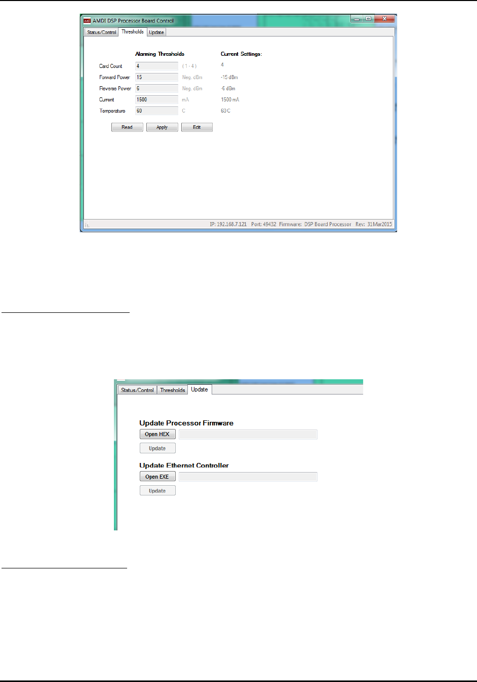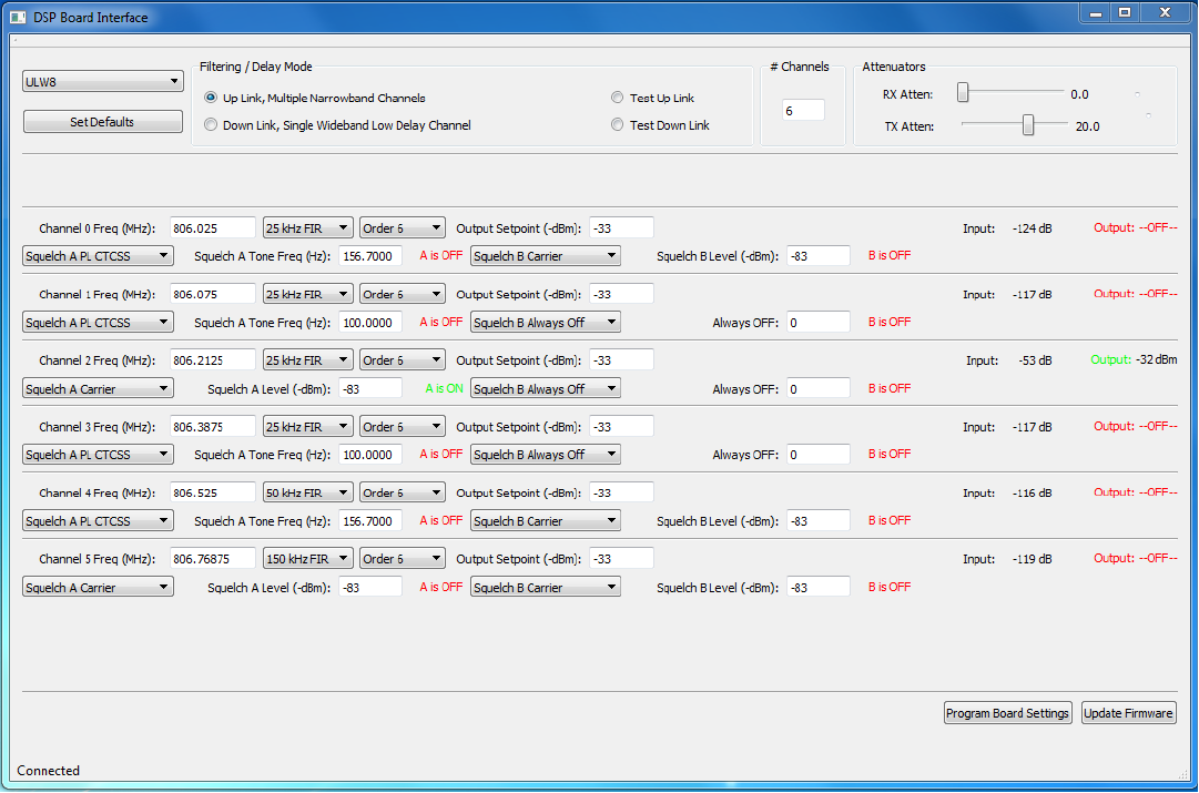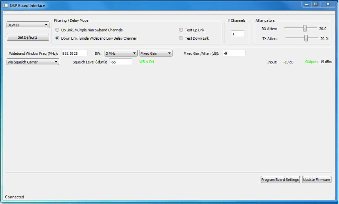 The pushbutton labeled “Update Firmware” is used to write new firmware into the DSP module. It lets