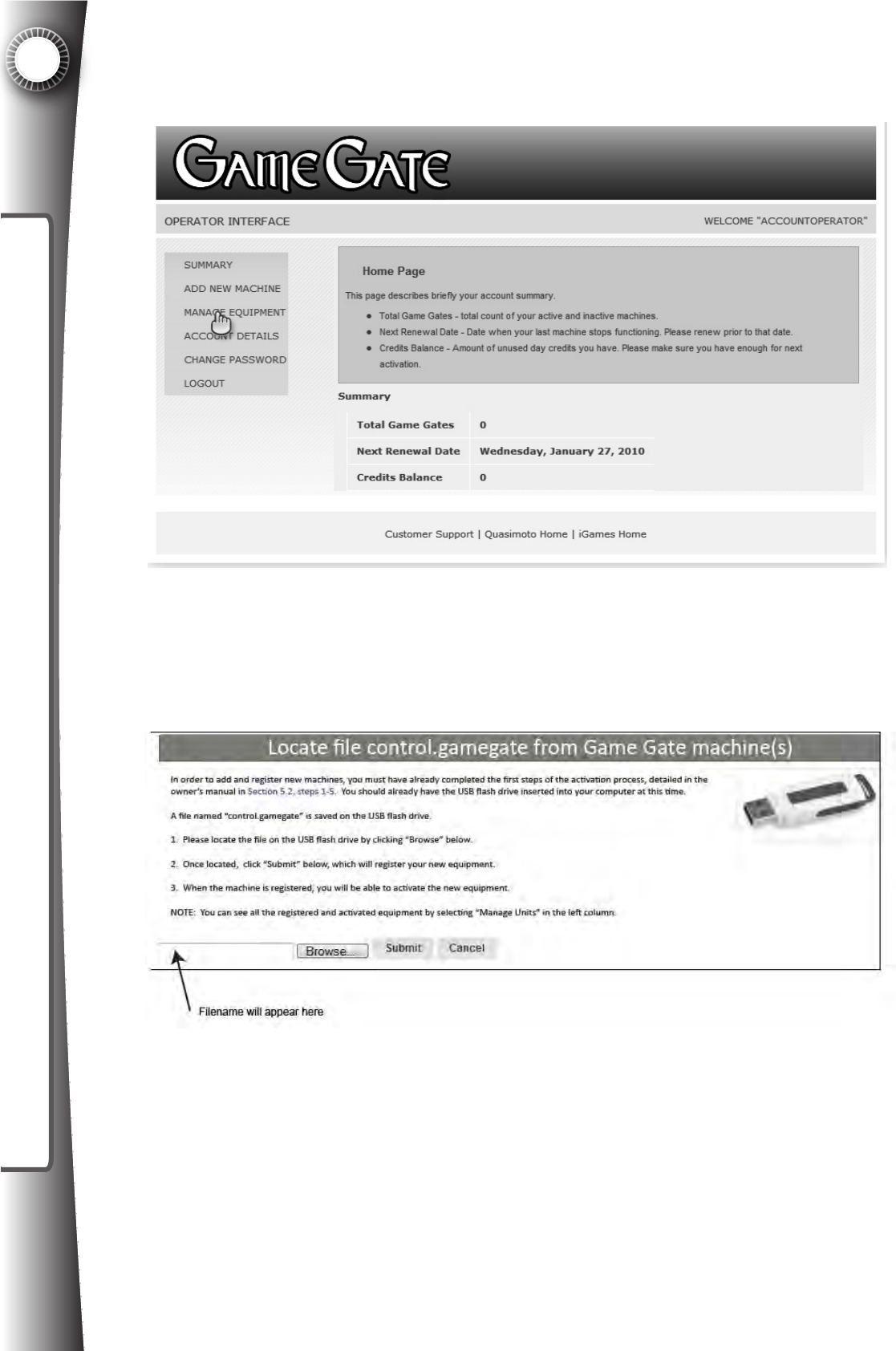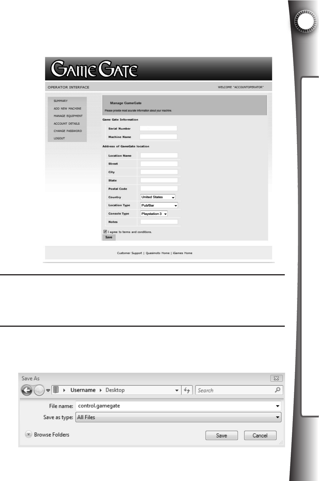 Operator – the person that owns the Game Gate™ VU and desires access to