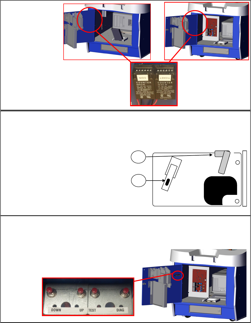will issue a credit without adding a number to the coin meter. Pressing the “Diag” button will al-