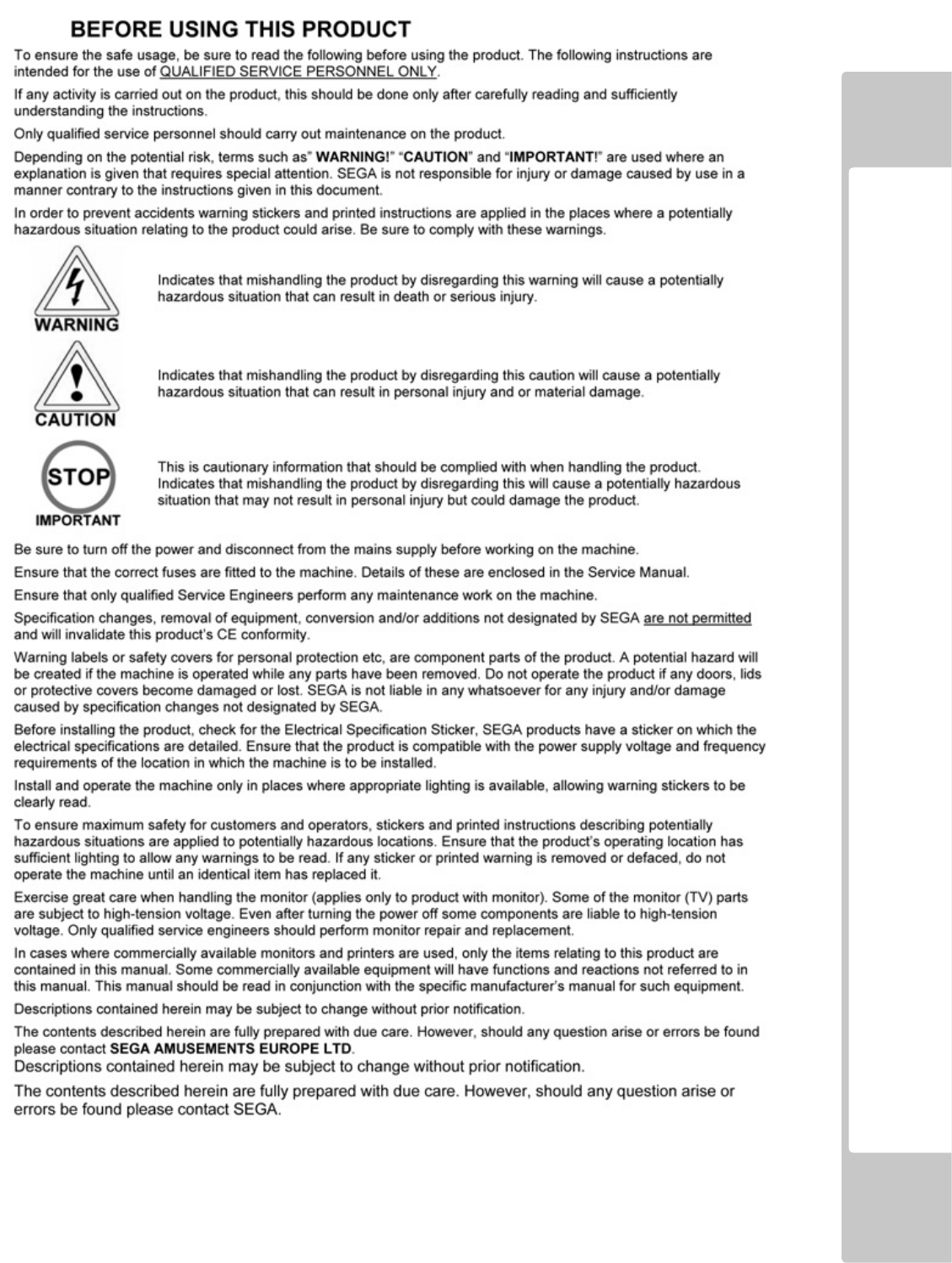 The DC power wire color for this product is dierent from previous SEGA titles. Working