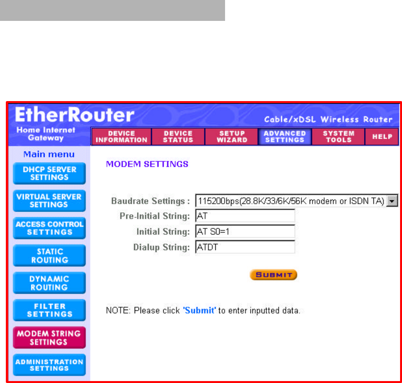 baudrate (speed), Modem Pre-initial, initial, dial-up and hangup strings. You