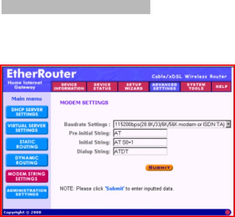 baudrate (speed), Modem Pre-initial, initial, dial-up and hangup strings. You