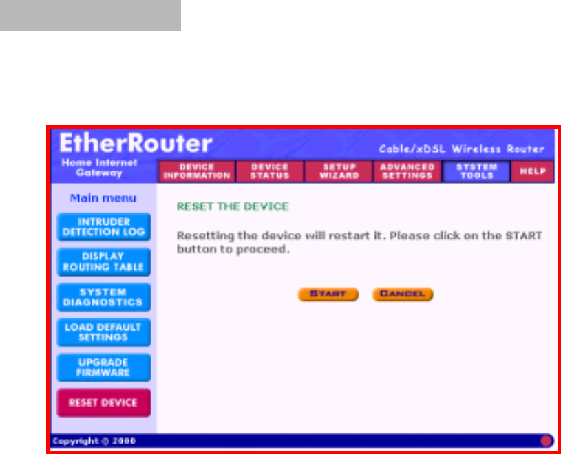 Resetting the device will restart it. Click on the START button to restart.