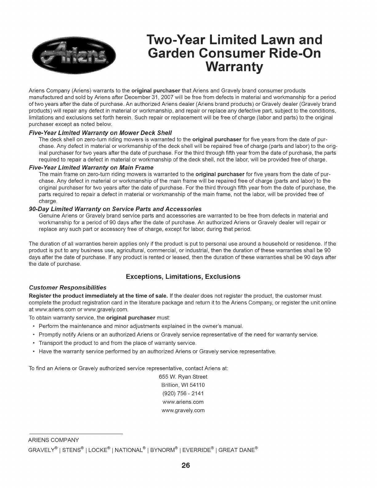 Ariens Company (Ariens) warrants to the original purchaser that Ariens and Gravely brand consumer products