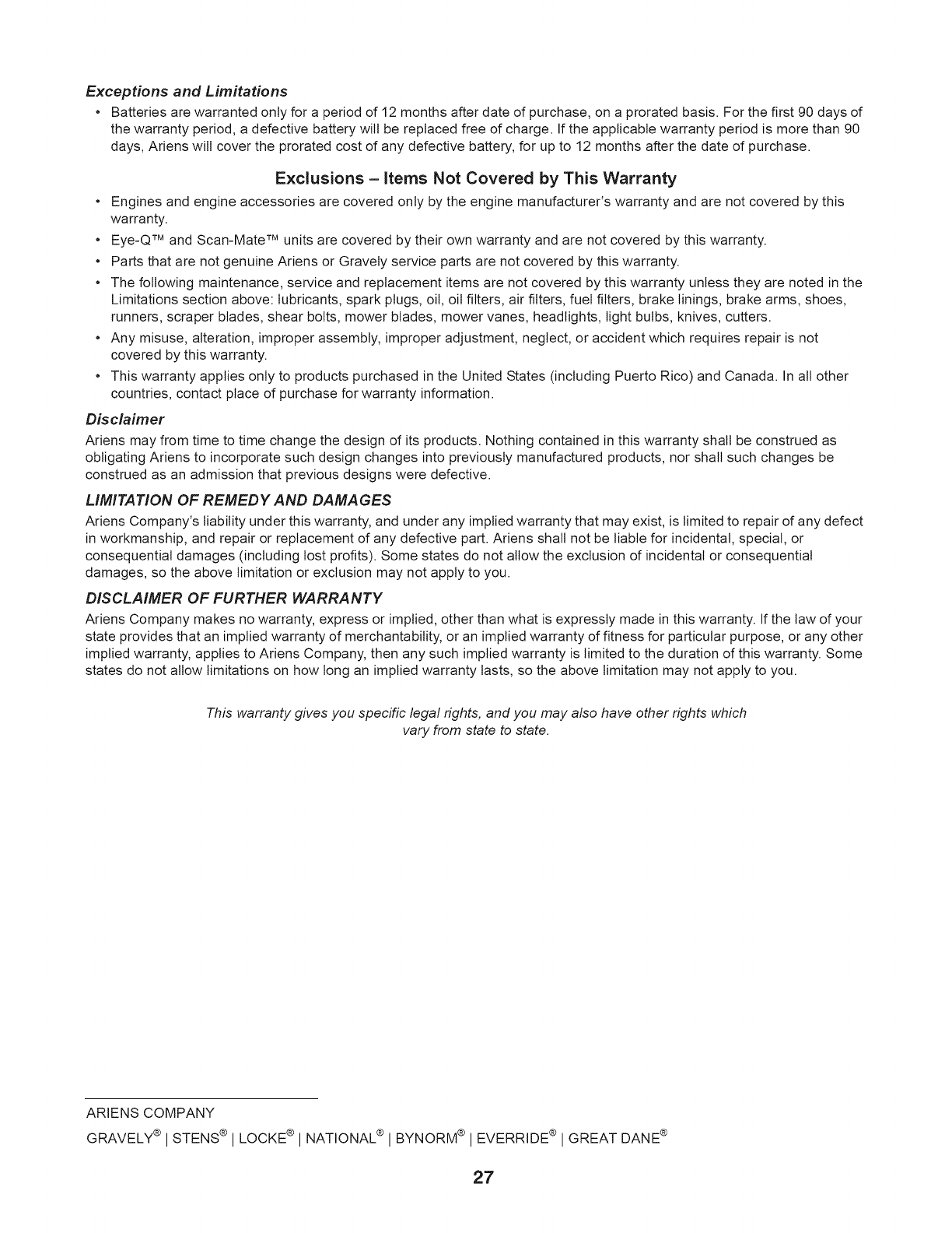 Ariens Company makes no warranty, express or implied, other than what is expressly made in this warranty. If the law of your