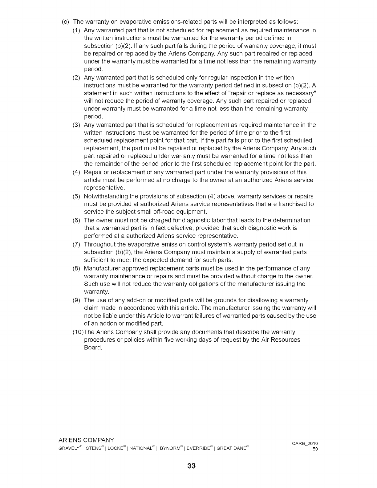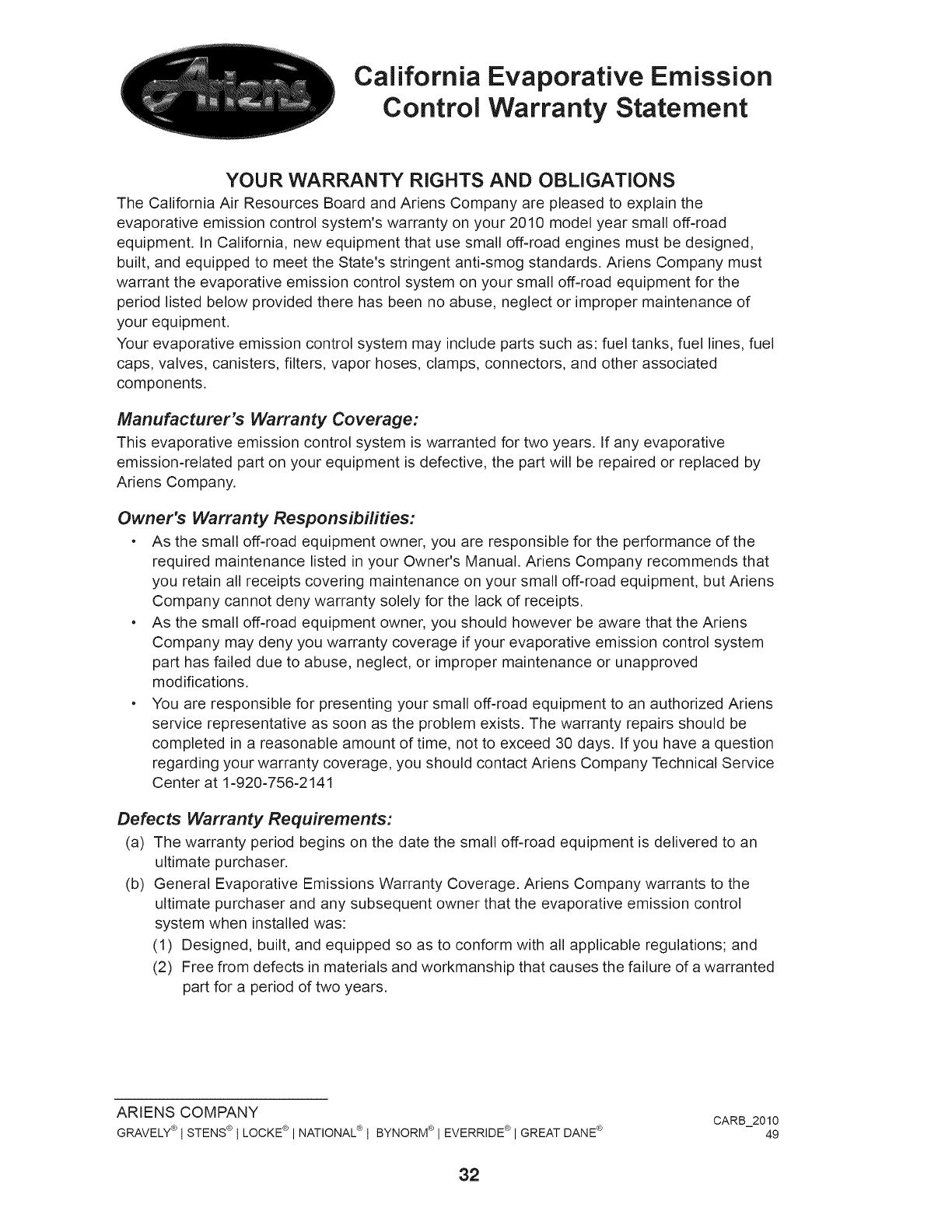 GRAVELY® I STENS® I LOCKE® l NATIONAL® l BYNORM® l EVERRIDE® I GREAT DANE ® CARB_2010