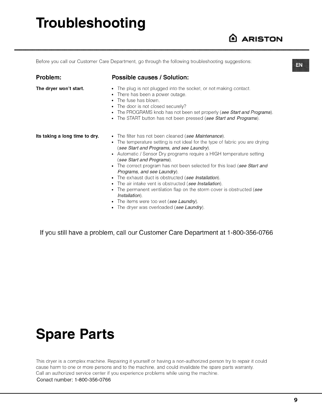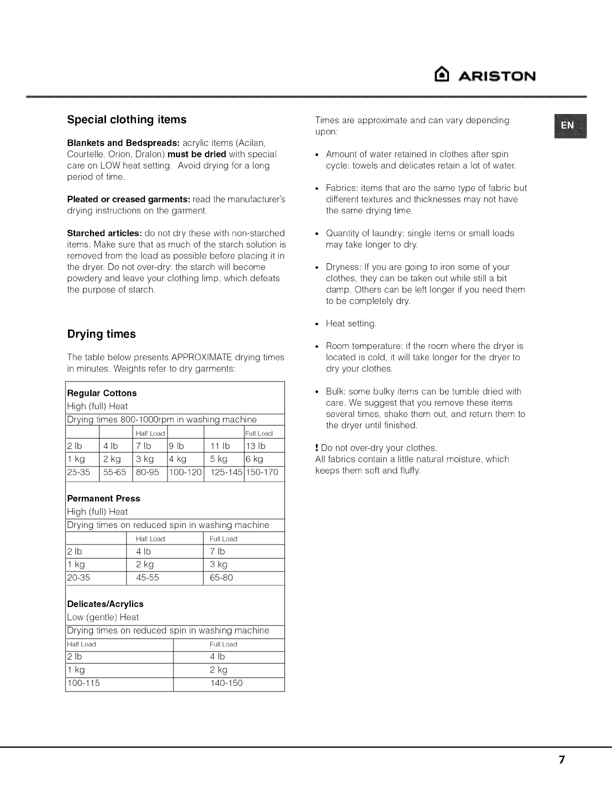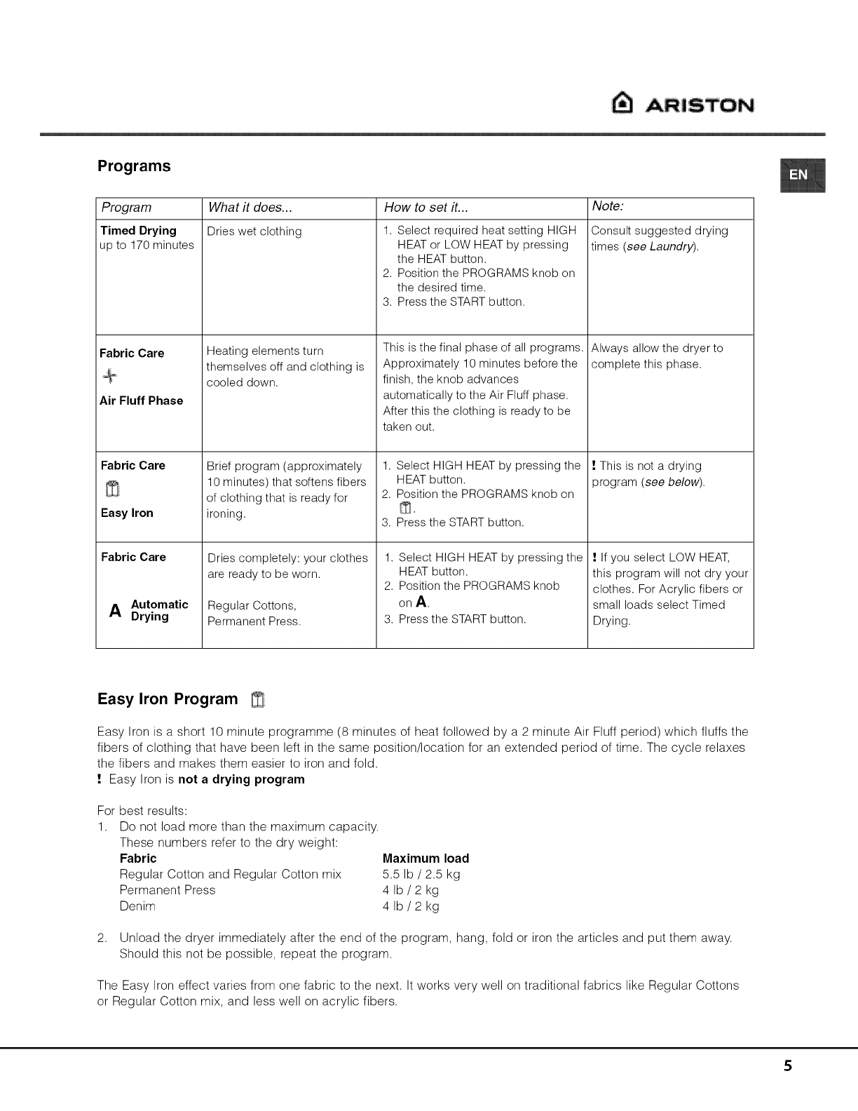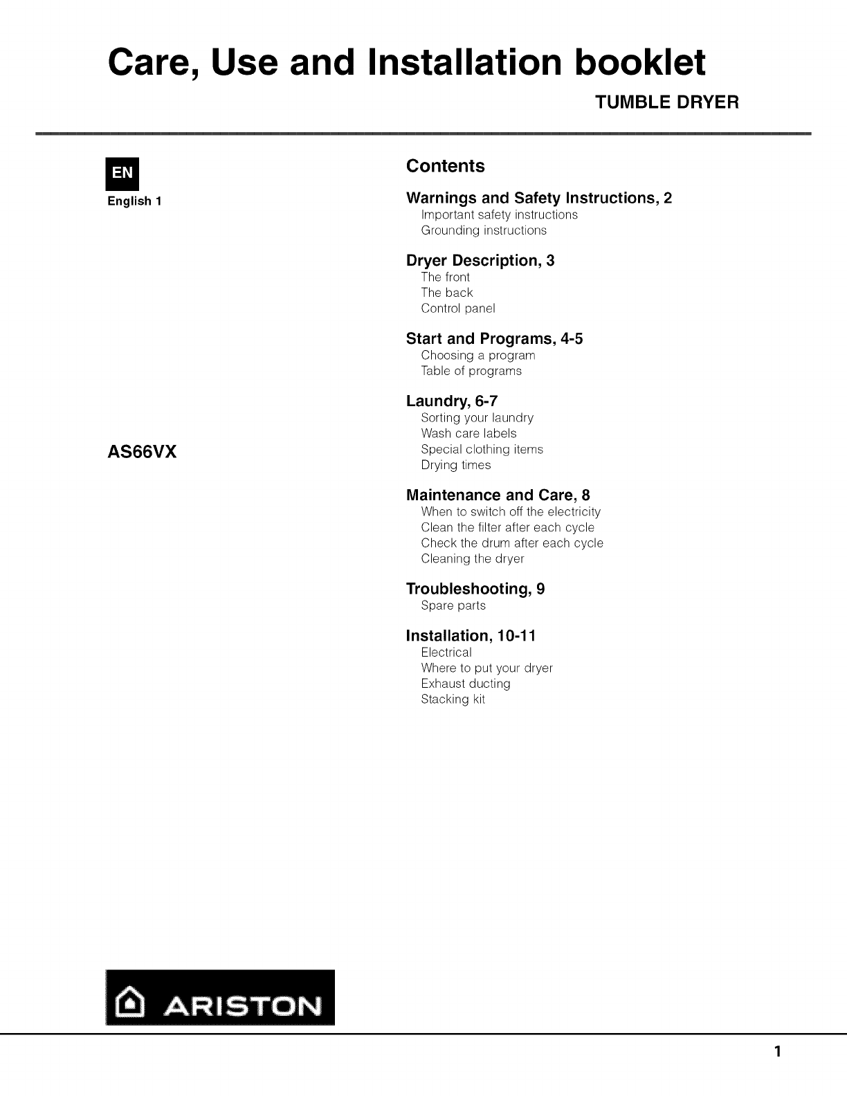 Ariston AS66VX User Manual DRYER Manuals And Guides 1410129L