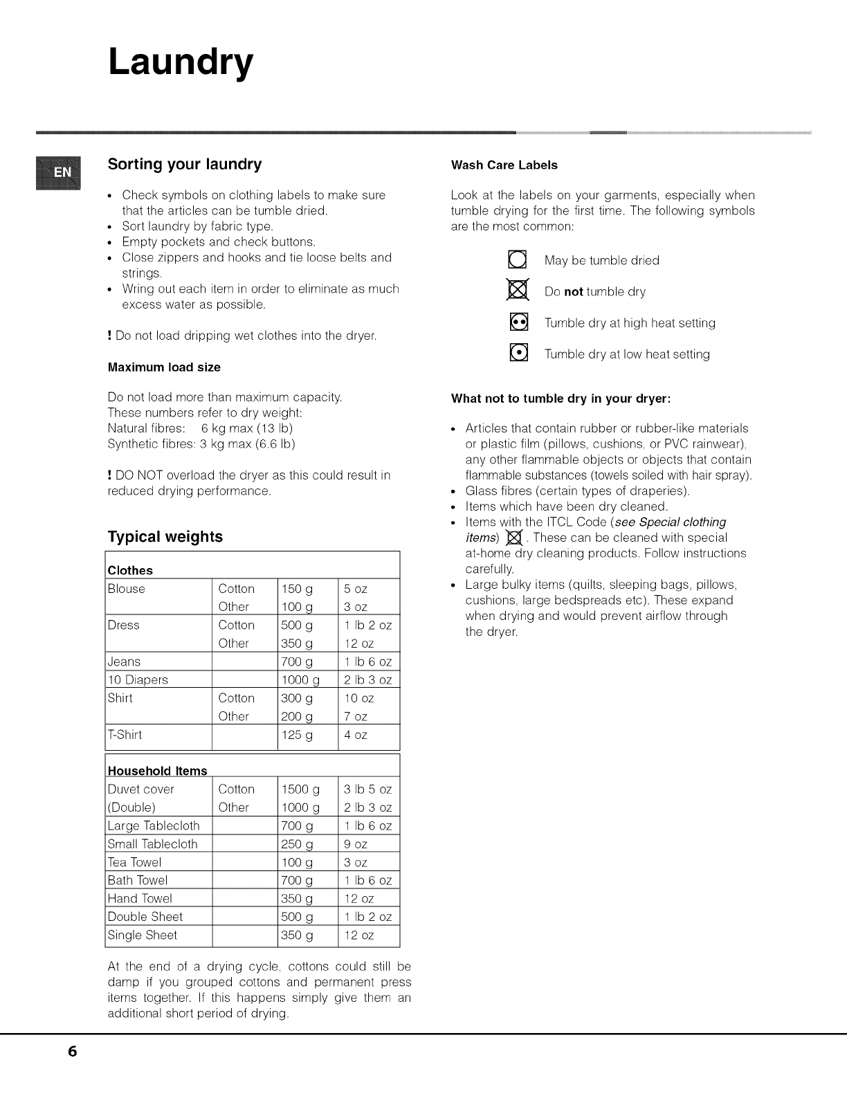 • Tumble dry items only if they have been washed with