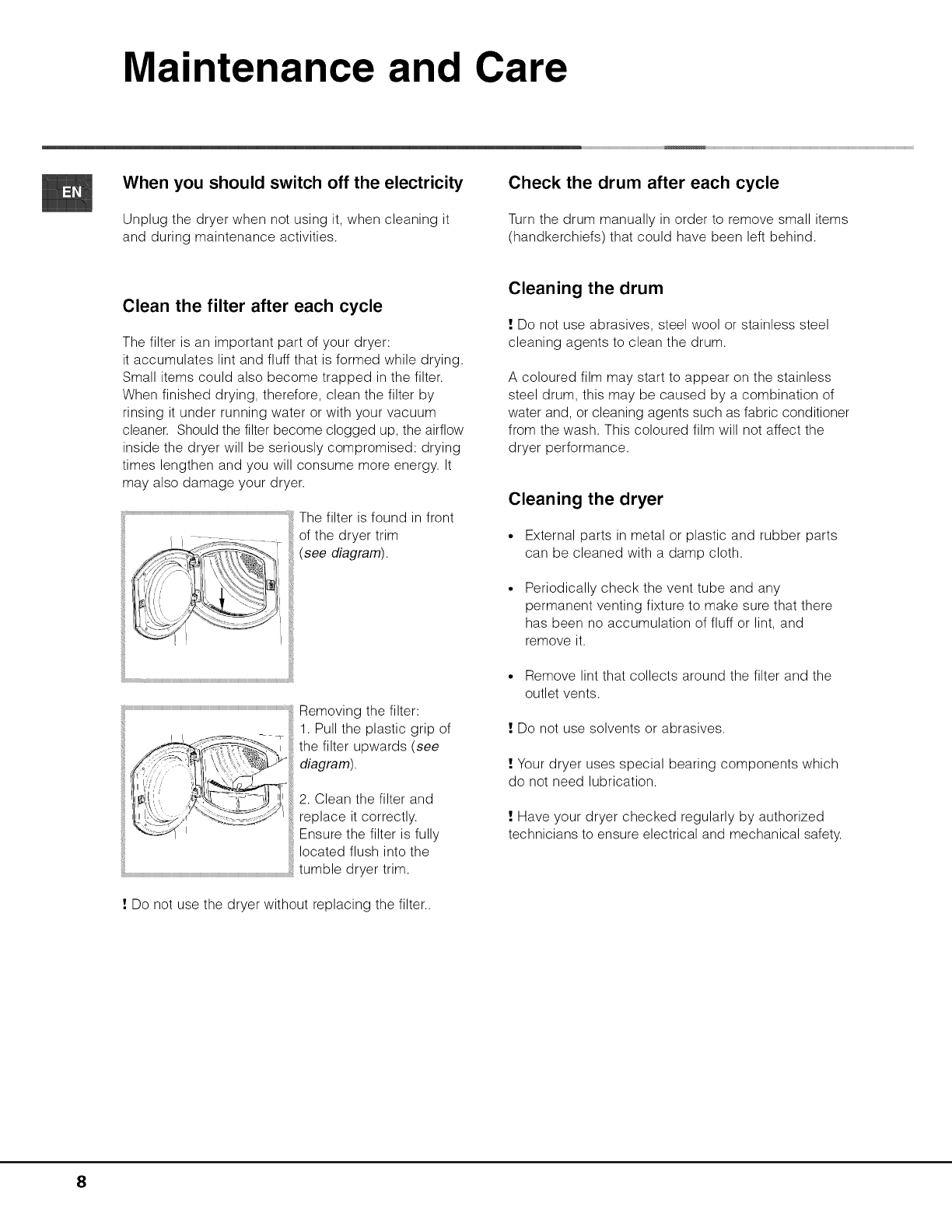 • Do not use the dryer unless the filter is securely in place