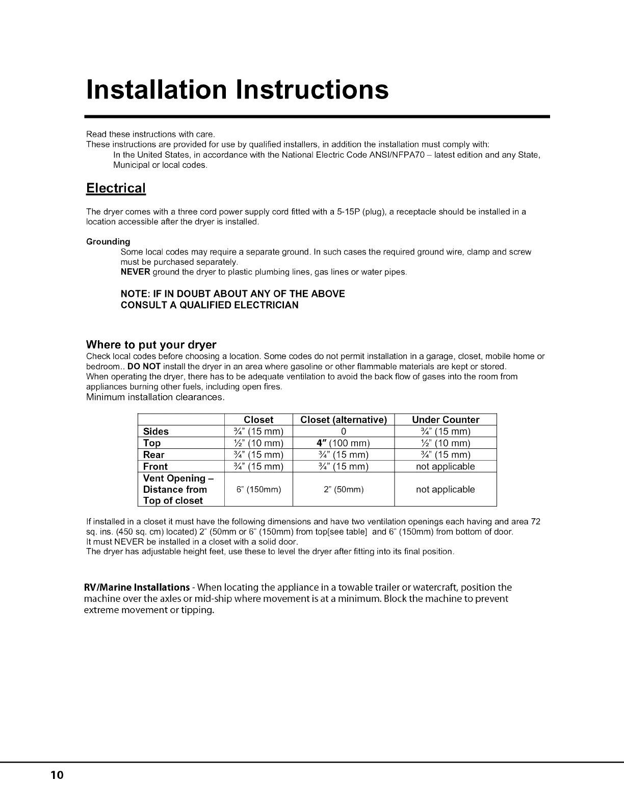 RV/Marine Installations - When locating the appliance in a towable trailer or watercraft, position the