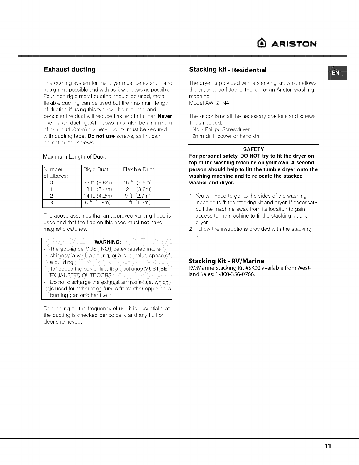 bends in the duct will reduce this length further. Never