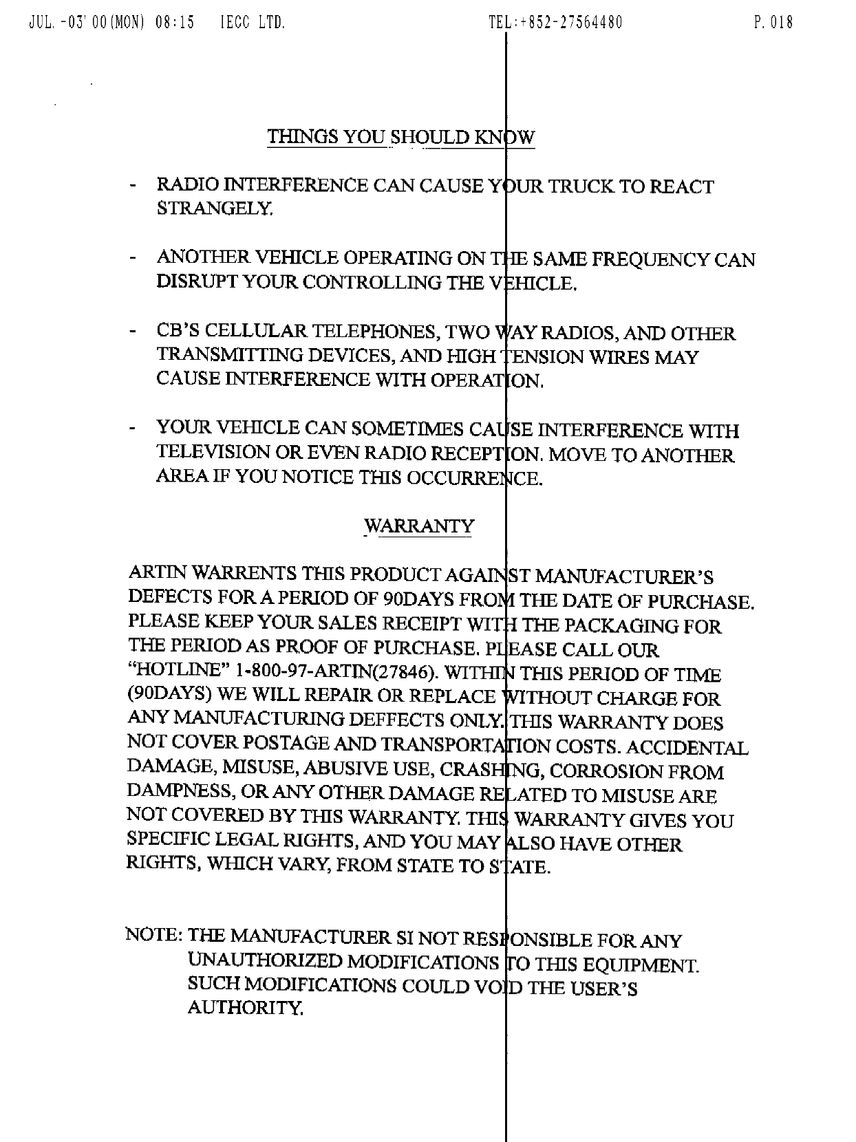 Artin Industrial Co Ltd Remote Control Car Users Manual