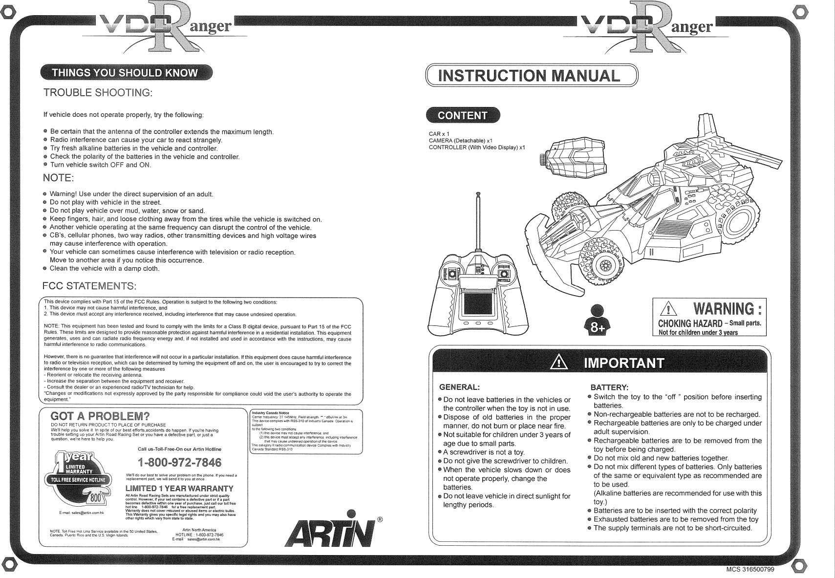 Artin Co 646100SP-VT Camera for RC Car User Manual 646100SP 316500799E