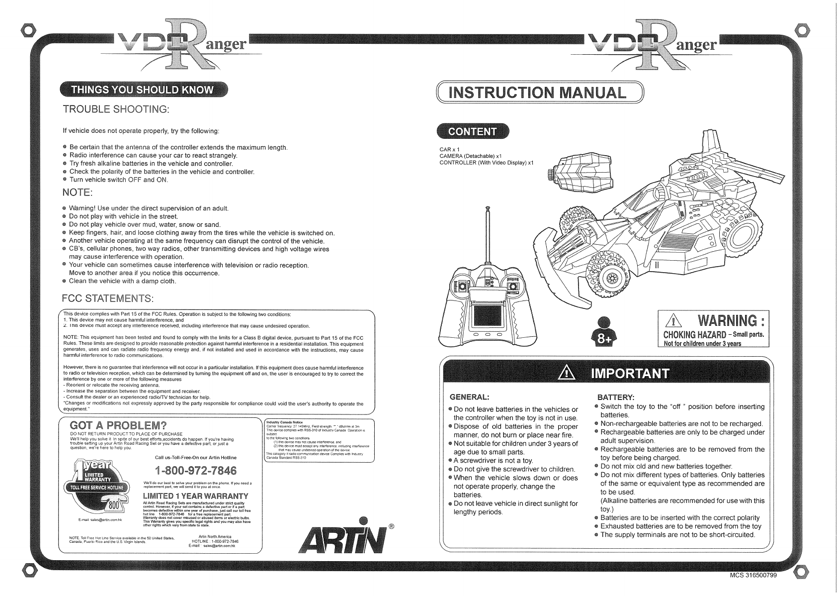 Artin Co 646100SP-VT Camera for RC Car User Manual 646100SP 316500799E