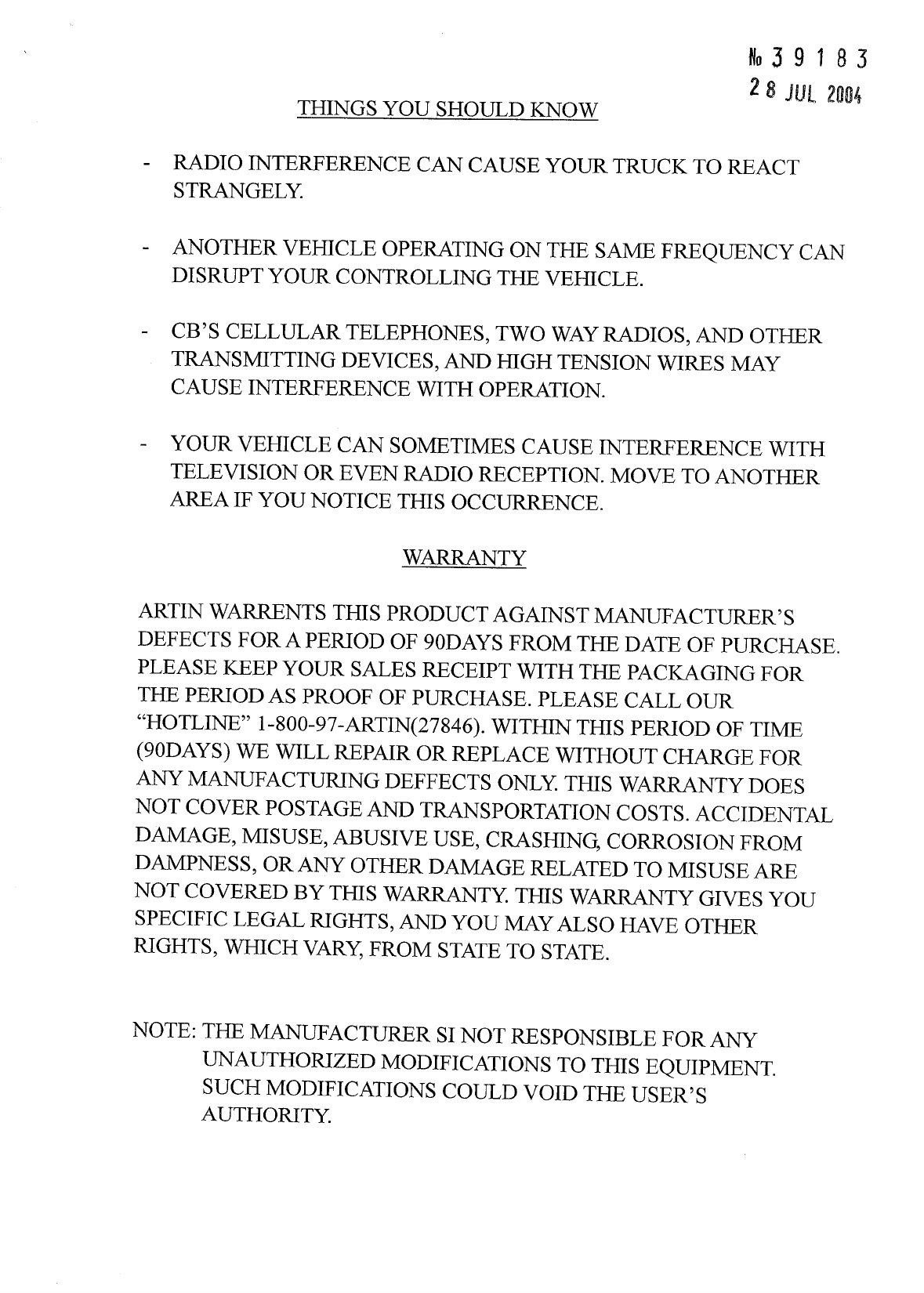 Artin Co 718001R 49MHz RC RECEIVER User Manual USERS MANUAL