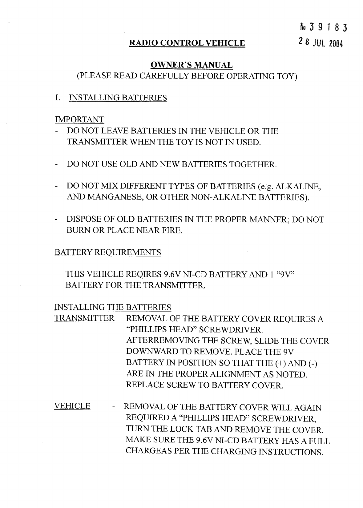 Artin Industrial Co Ltd 49MHz RC TRANSMITTER USERS MANUAL