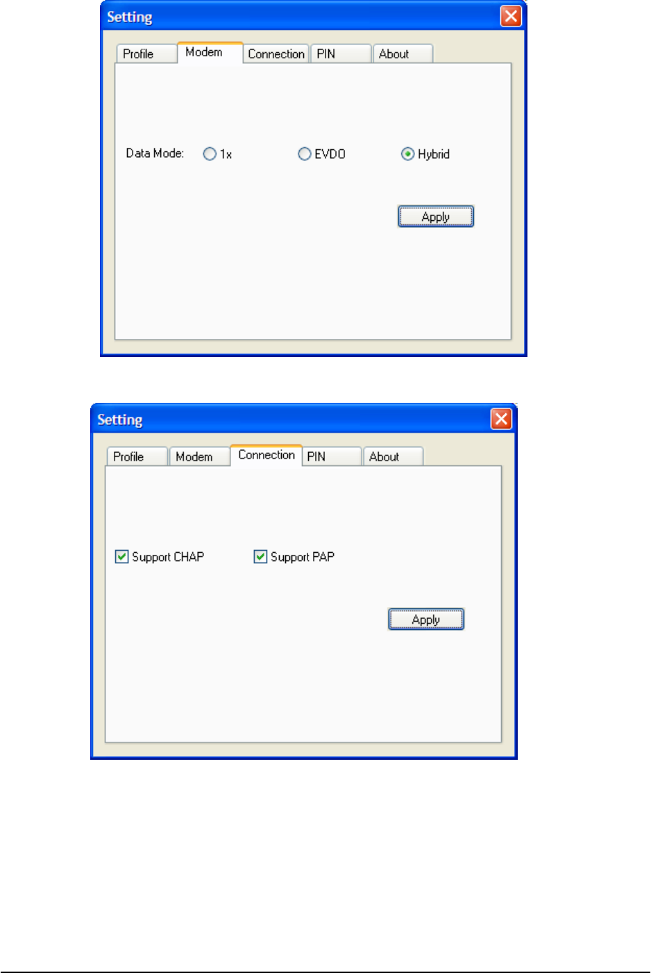 2). Press <Modem>, you can select data mode: 1x / EVDO /Hybrid, then press <Apply> to save