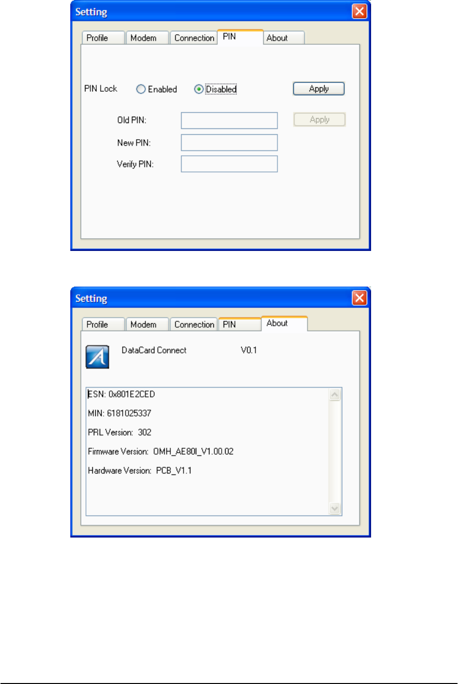 5). Press <About>, you can see the detail information: DataCard Connect Version, ESN, MIN,