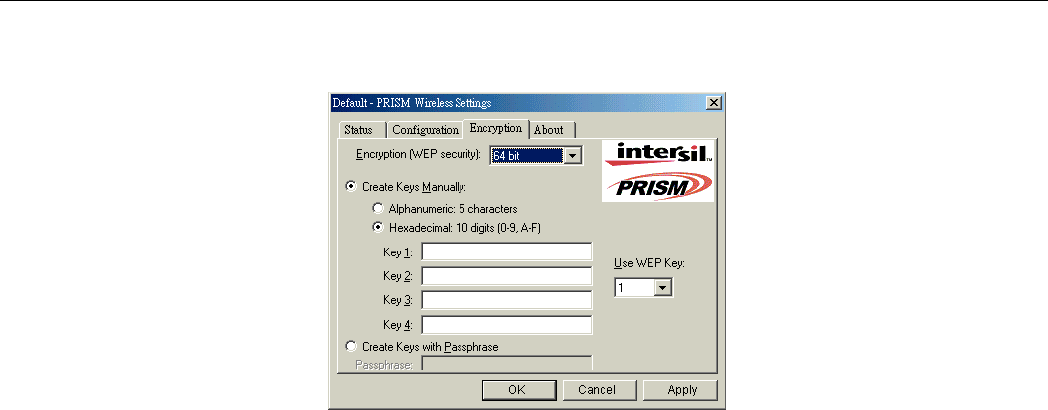 Figure 3-4 PRISM Wireless Settings Utility – Encryption Tab.............................................................................. 20