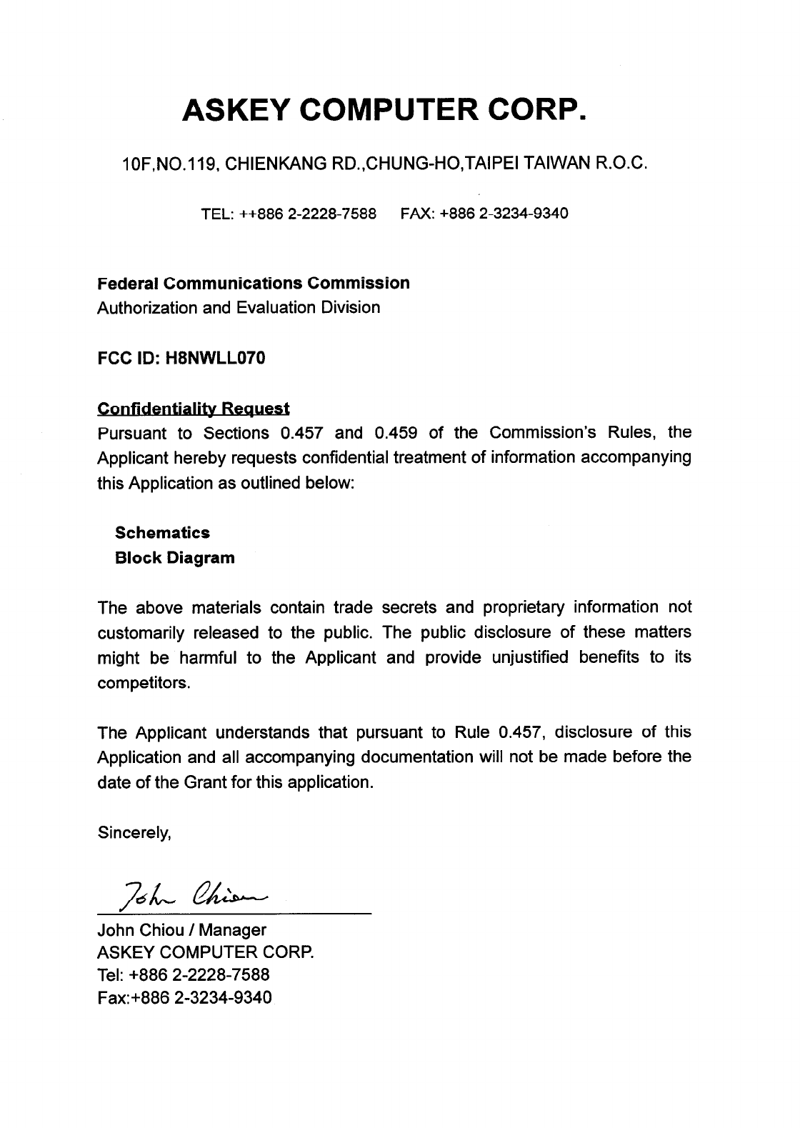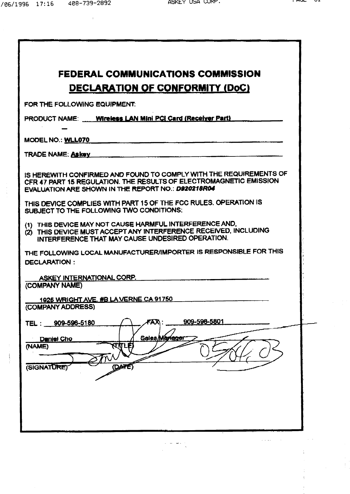 Askey Computer WLL070 Wireless LAN Mini PCI Card User Manual WLL070