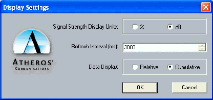 To change the display settings, choose Options > Settings from the Atheros Client Utility menu. The display settings dialog box contains tools to set these parameters: