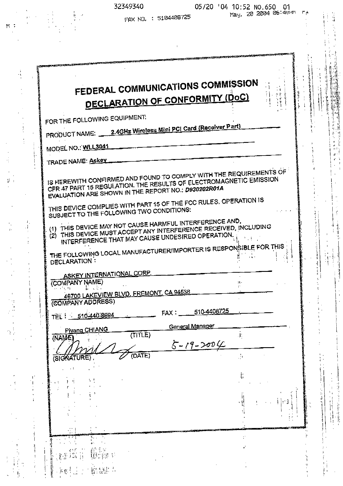 Askey Computer WLL3041 2.4 GHz Wireless Mini PCI Card User Manual y 31 XDW