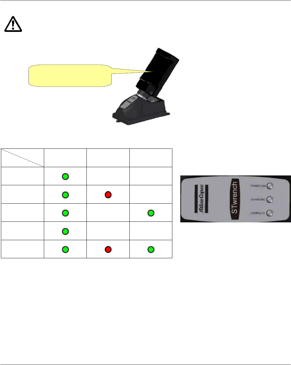 The three LEDs on the battery charger indicate the battery charge status: