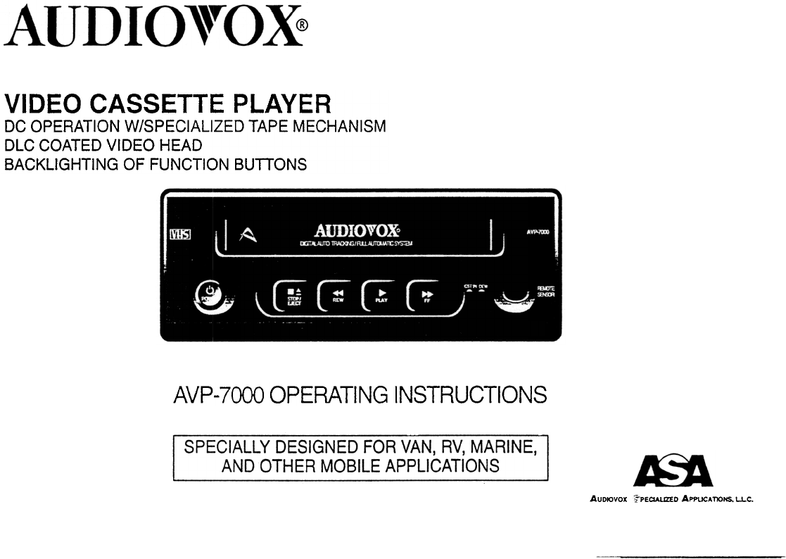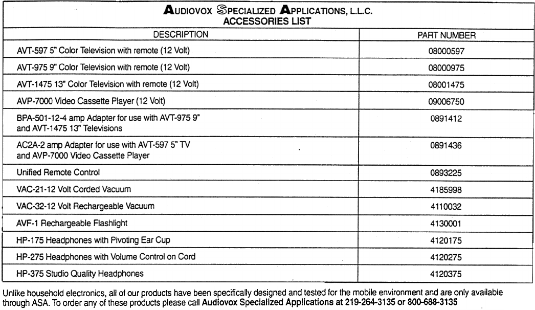 through ASA. To order any of these products please call Audiovox Specialized Applications at 219-264-3135 or SO0-688-3135