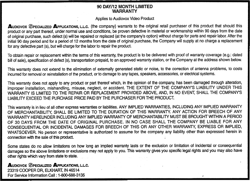 AUDIOVOX @PECIAUZED APPUCATIONS. LLC. (the company) warrants to the original retail purchaser of this product that should this
