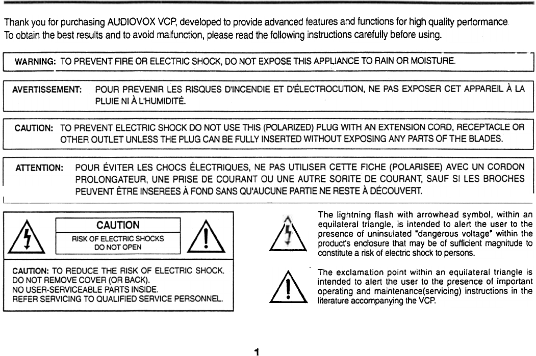 Thank you for purchasing AUDIOVOX VCP, developed to provide advanced features and functions for high quality performance