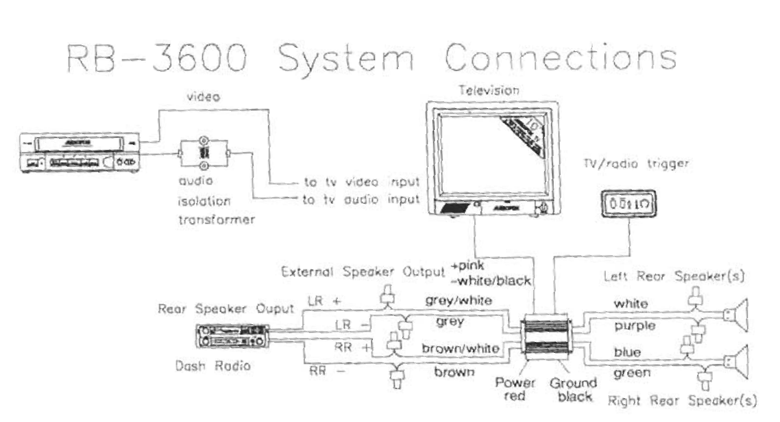 Connect the Audiovox television external speaker output to the RB-3600 as follows:
