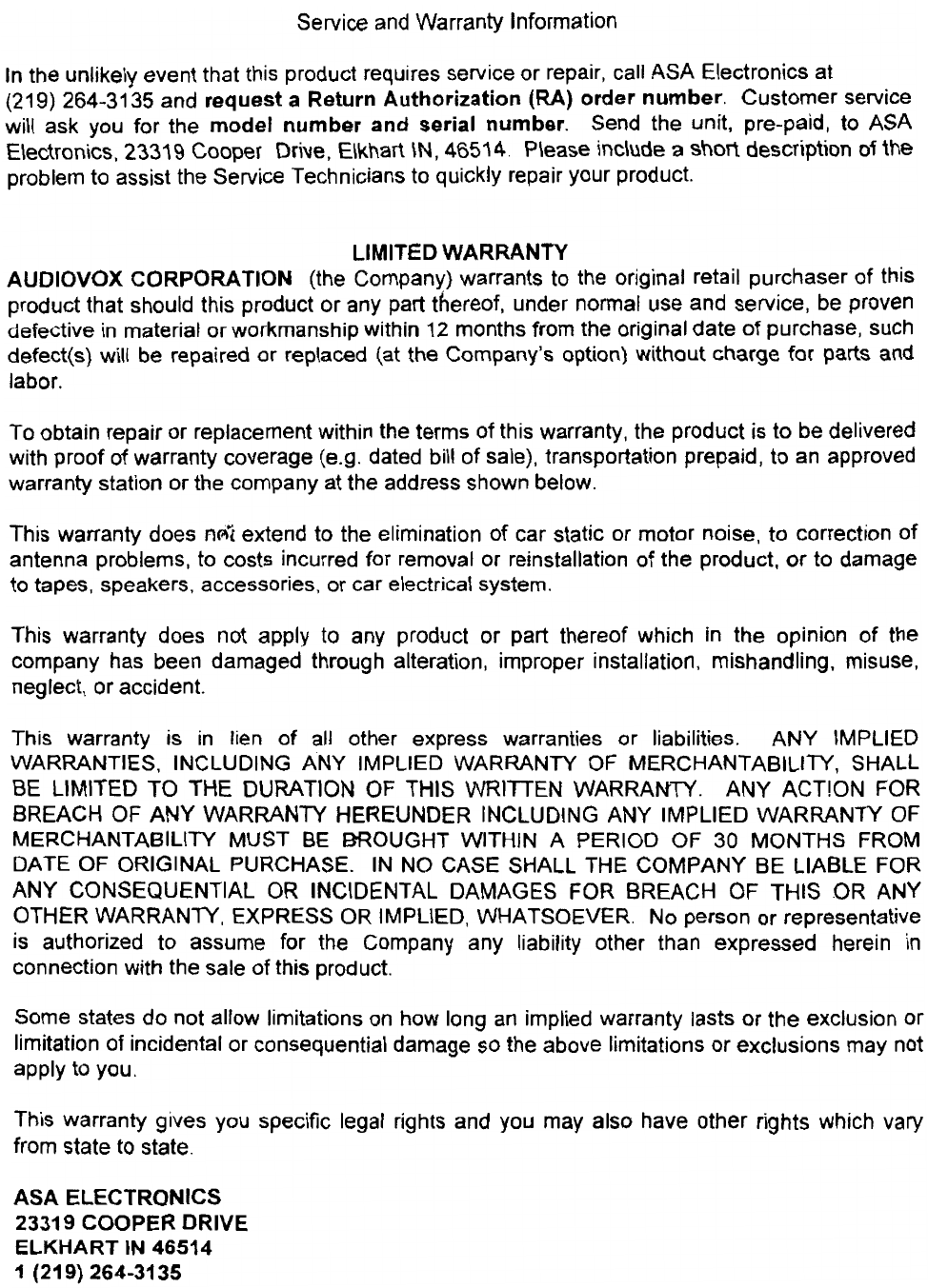 AUDIOVOX CORPORA TION (the Company) warrants to the original retail purchaser of this