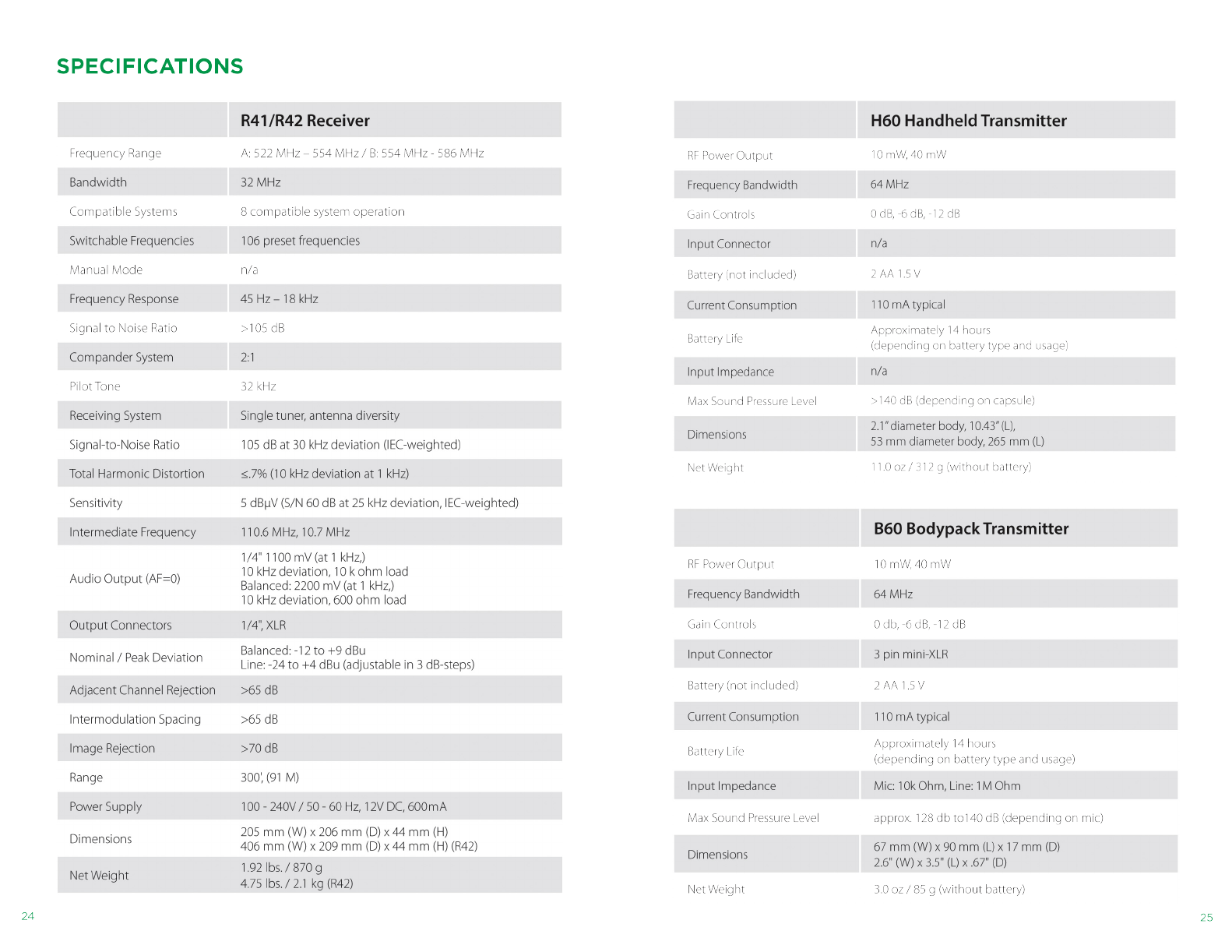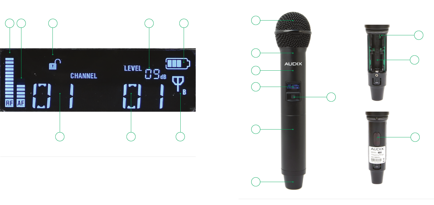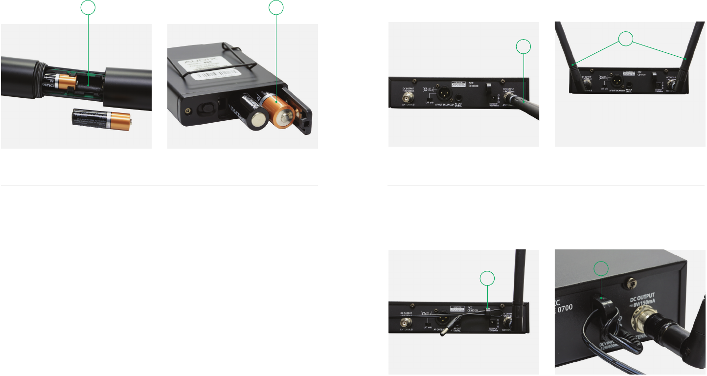 1. Install 2 AA batteries in the handheld transmitter and bodypack. Refer to the
