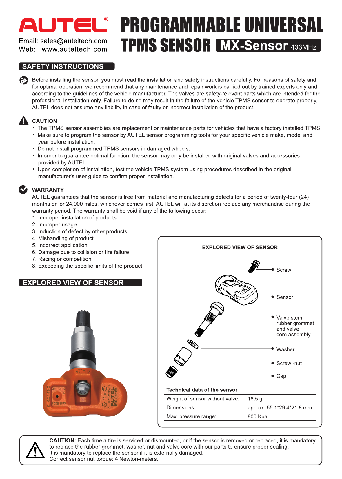 Autel Intelligent Tech. Corp., Ltd. Universal Tire Pressure Sensor MX Sensor Manua Wirelessl 433