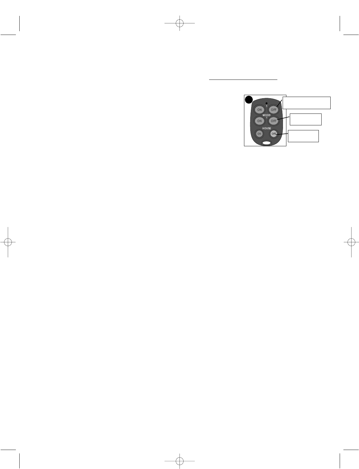 The middle ON and OFF (MOOD 1) buttons of the KEY CHAIN REMOTE will activate all Receivers programmed on the MOOD 1 setting on