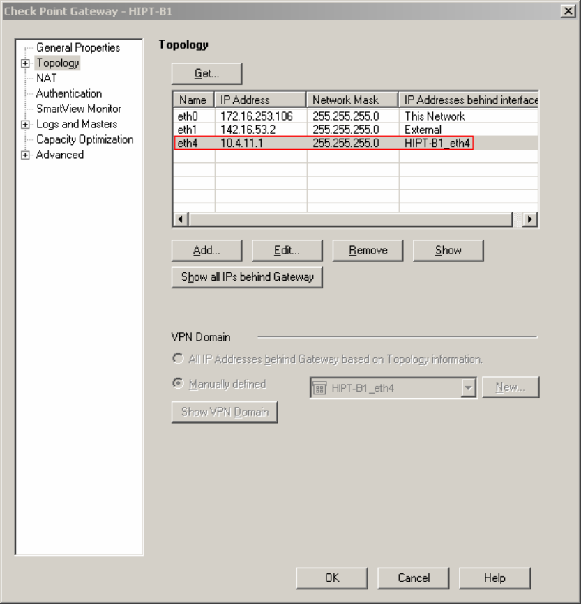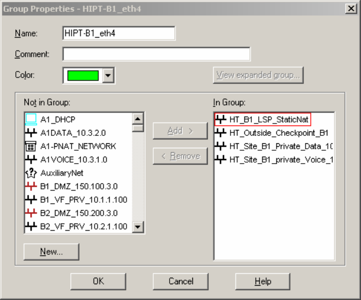 Checkpoint Firewall HIPT-B1 located in enterprise site B1. The Group HIPT-B1_eth4 is made