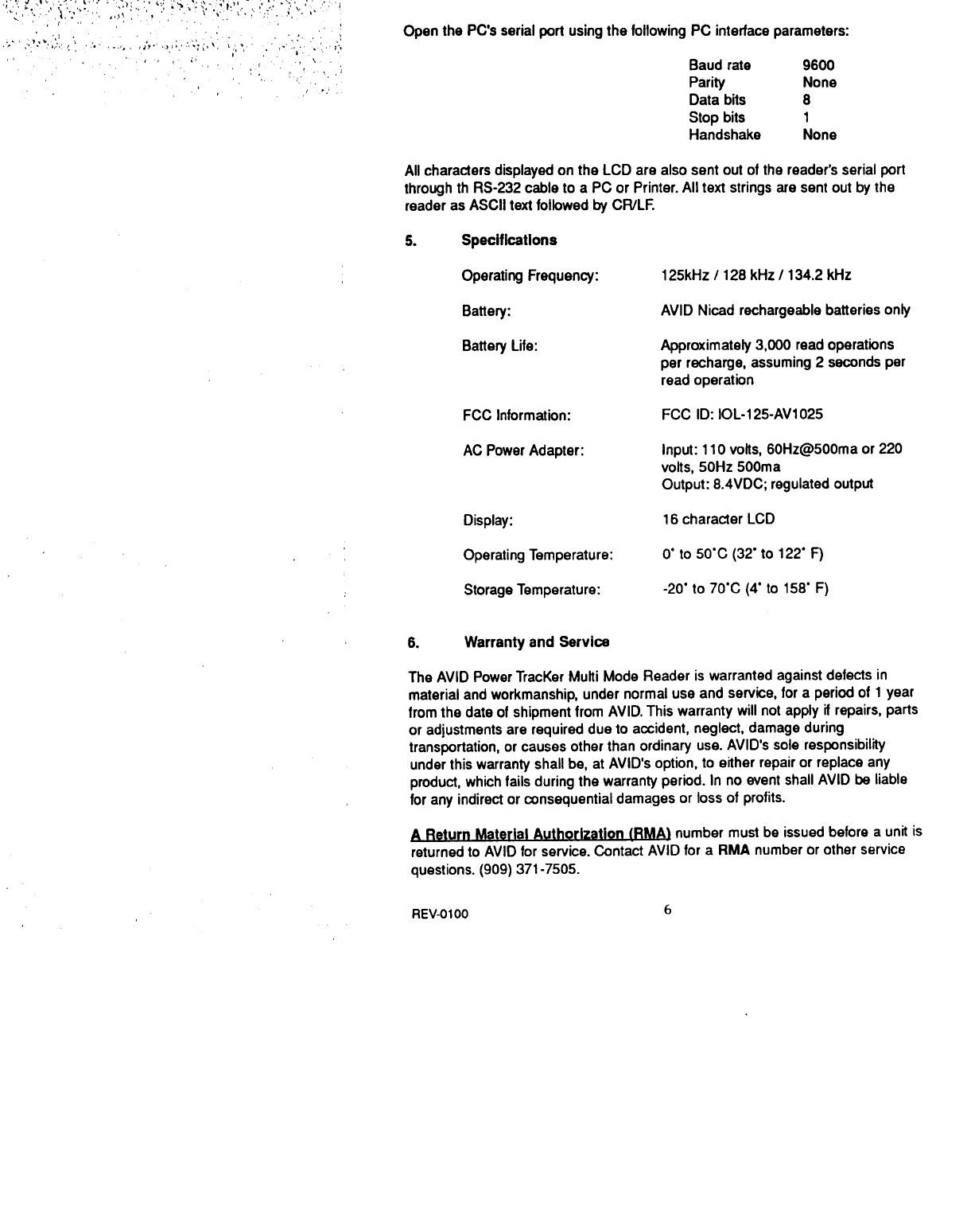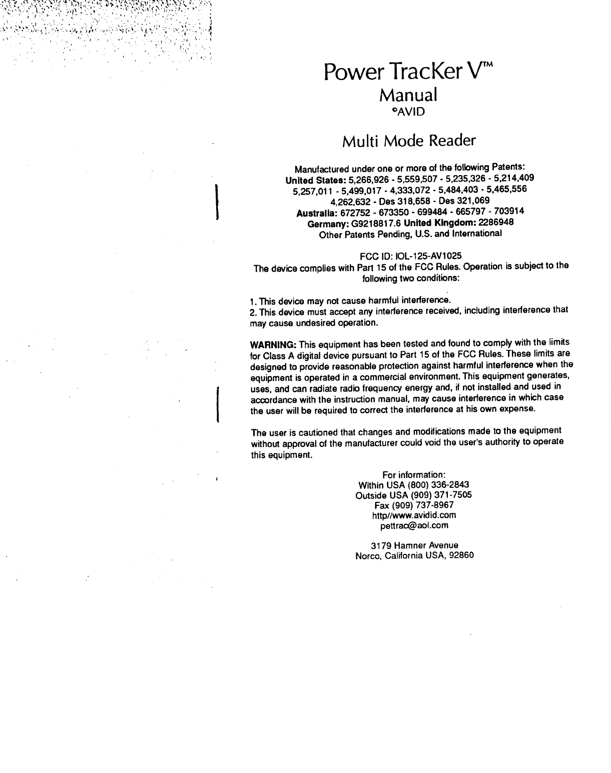 Avid Identification Systems 125-AV1025 Tag Reader User Manual Owners Manual