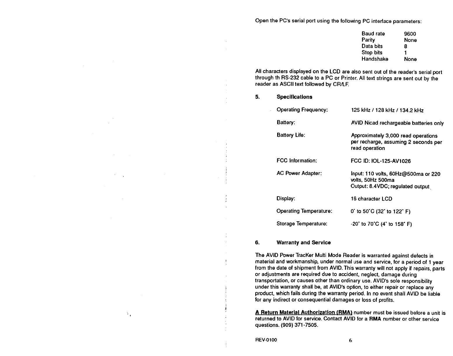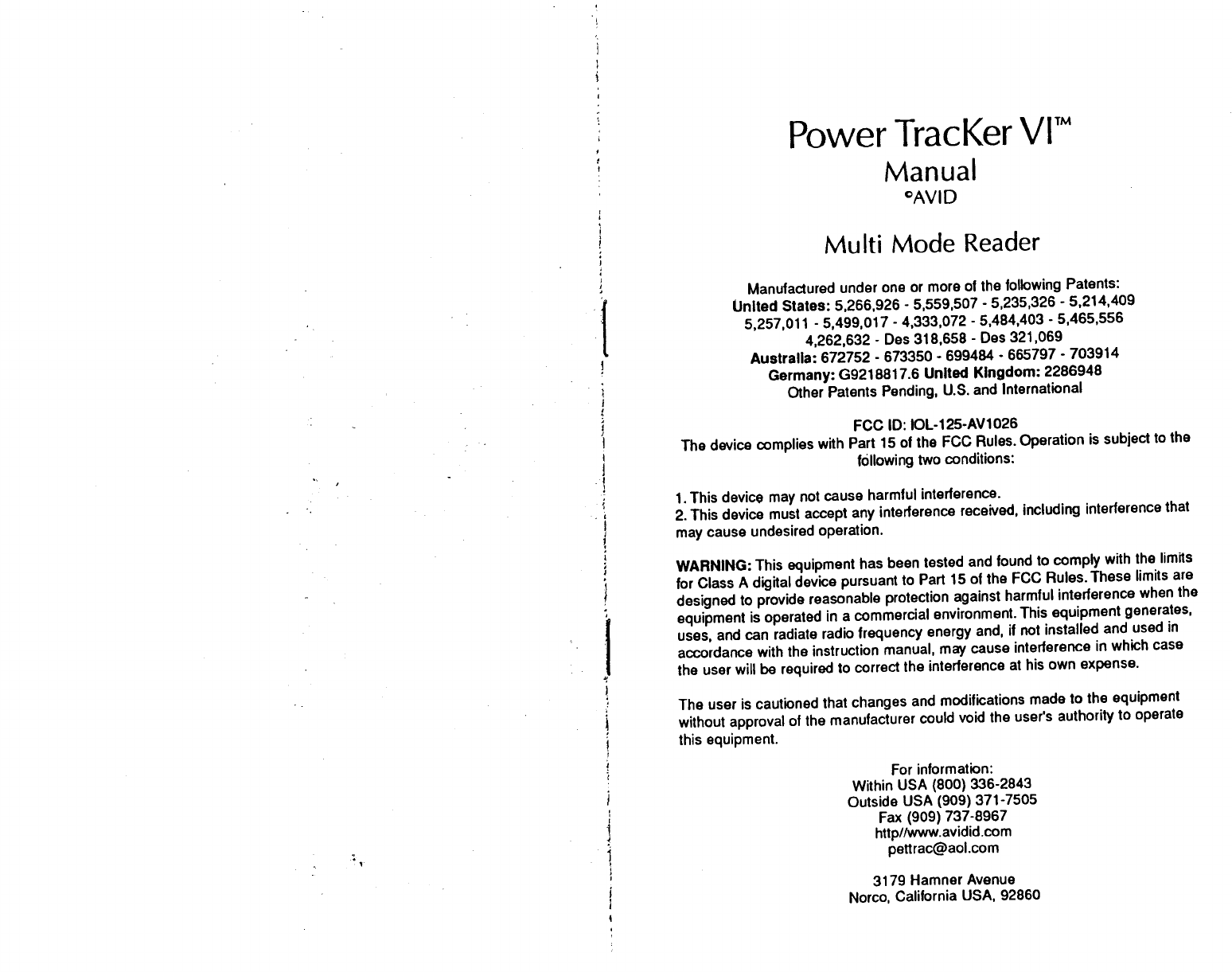 Avid Identification Systems 125-AV1026 Tag Reader User Manual Owners Manual